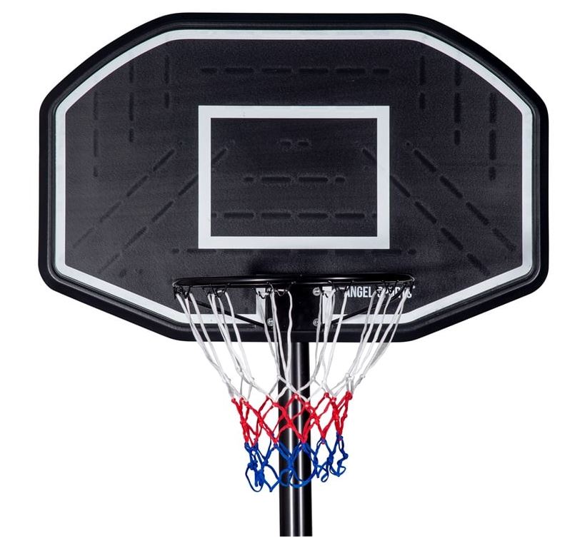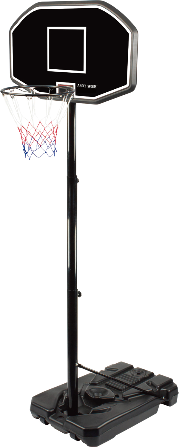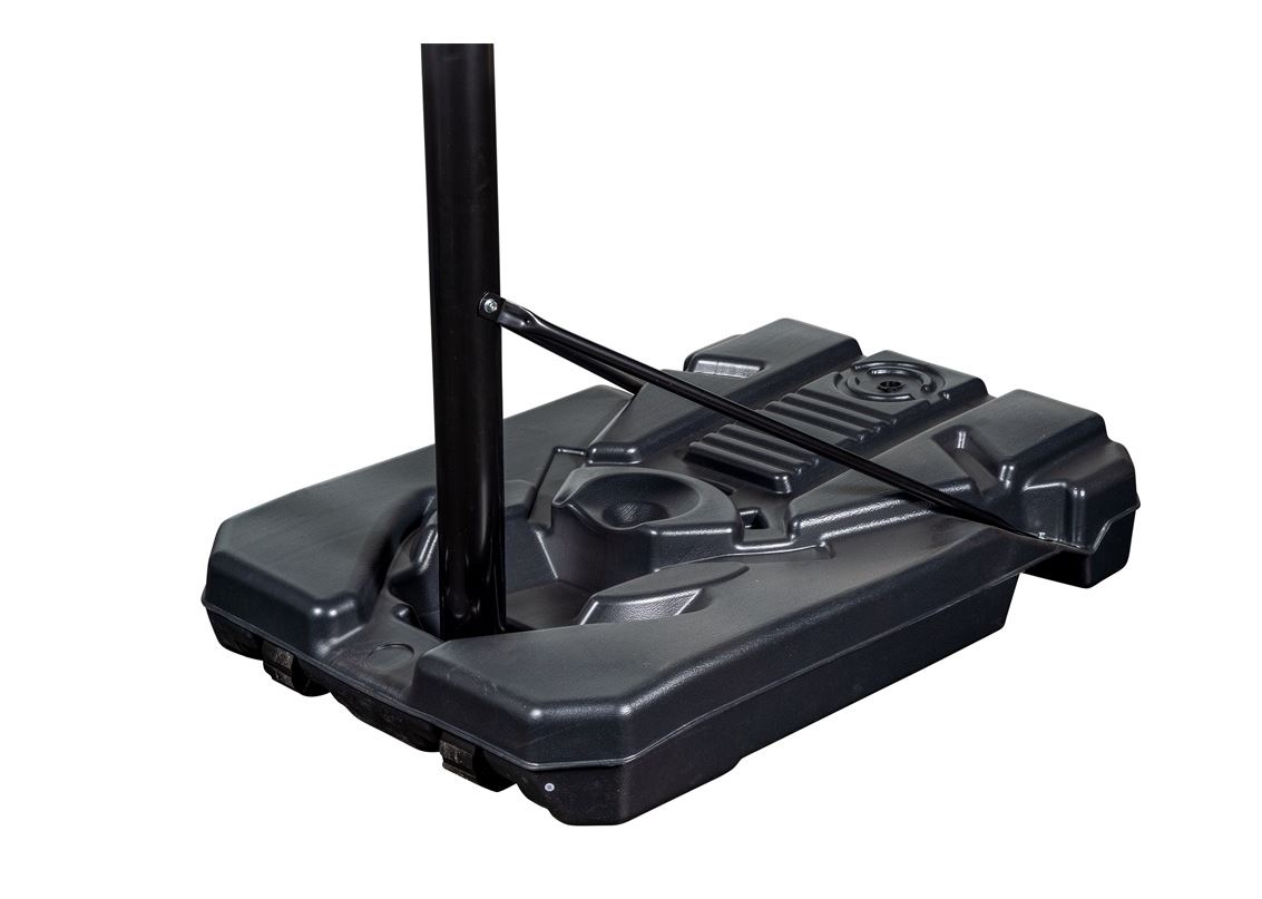 Basketbalstandaard metalen buizen, Ø80mm. Basketbalring Ø45cm inclusief weerbestendig nylon net. Ringhoogte verstelbaar van 200cm tot maximaal 305cm . Backbord PE is 109 x 72 x 2cm groot. De PE voet, 108 x 74 x 17cm.