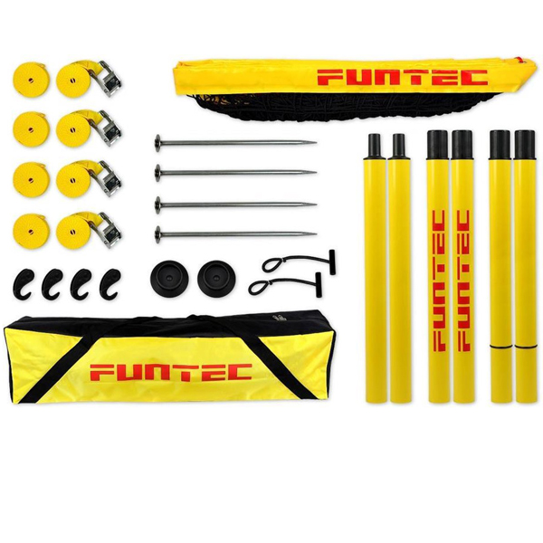 Funtec Beach Champ Set: een mobiel beachvolleybal-wedstrijdnetsysteem met sterke kunststof netpalen voor training en competitie van professionele beachvolleyballers.