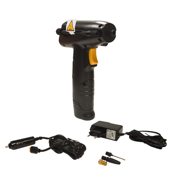 De pomp wordt geleverd in een handige tas, met extra verleng stuk, nippelset, een verlengstuk met druk beperker, een adapter en een oplaadbare batterij en een auto op-lader.