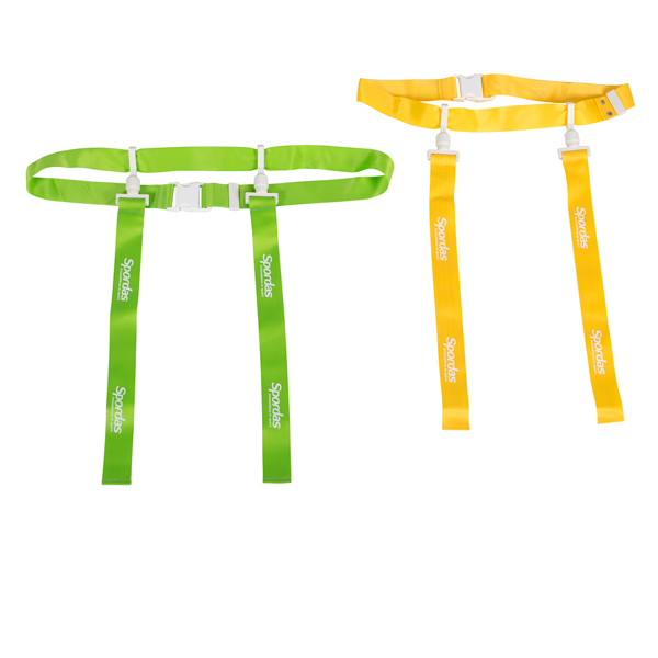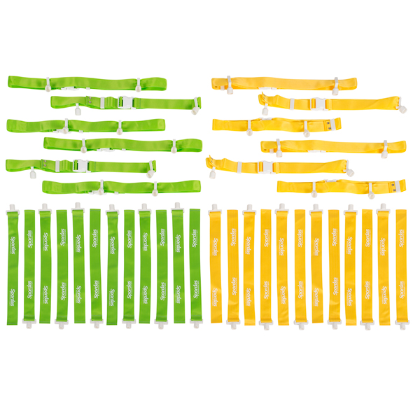 Ideaal voor het leren van rugby of American football of om flagball te spelen. Deze verstelbare riemen hebben vlaggen die "ploppen" wanneer ze van de riem worden getrokken, waardoor blokkeren of tackelen wordt gesimuleerd. Set van 12 riemen, 6 geel en 6 groen. Elke riem bevat twee vlaggen. Riemlengte: 115 cm. Vlaggengrootte: 42x4 cm.
