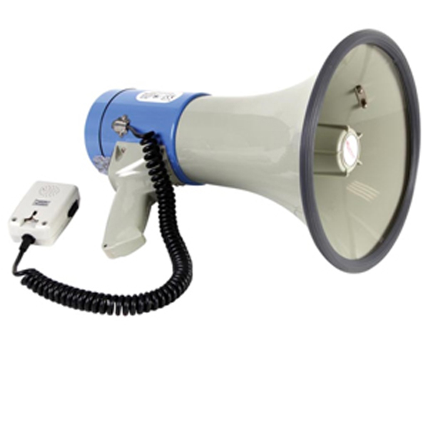 Een betaalbare krachtige handluidspreker met sirene en regelbaar volume. De megafoon is voorzien van een praktische schouderband. Spiraalsnoer eindigt op een afneembare anti-feedbackmicrofoon met aan-uitschakelaar en volumeregeling. Behuizing in ABS-plastic. Exclusief 8 batterijen welke ca. 6 uur meegaan.