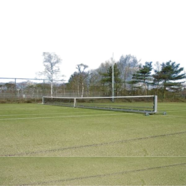 Aluminium tennisinstallatie, met ingebouwd traploos windwerk. Aluminium verbindingsbrug tussen de palen,