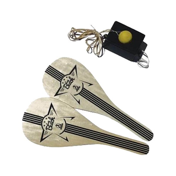 Topkari een leuk tennisspel. Deze Beachtime set van 2 rackets in stoer hout met opdruk, een bal met elastiek en standgewicht zorgt voor veel plezier! Doordat de bal met een elastiek aan het gewicht vast zit, zal deze nooit verder vliegen dan de bedoeling is en kun je zo hard slaan als je wilt, zonder dat je de bal moet gaan zoeken.