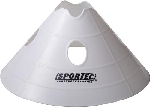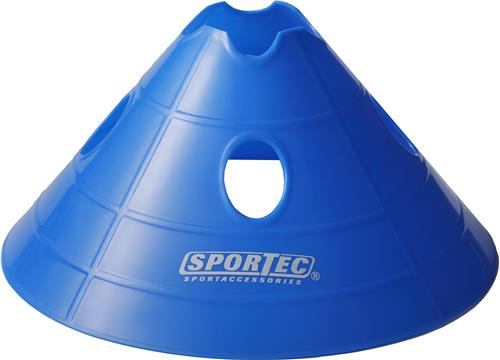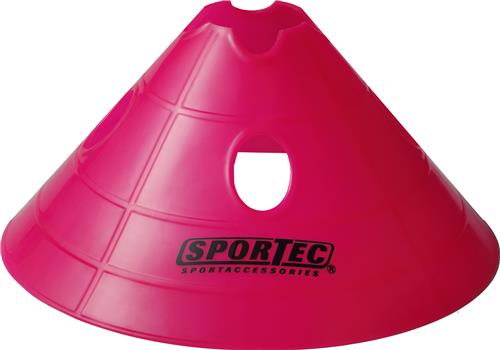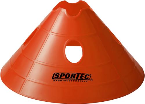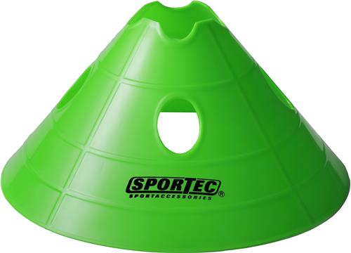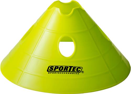 Set van 10 extra grote zachte afbakbollen met gaten. Hoogte 15 cm - Ø 30 cm. Voorzien van inkepingen op de bovenzijde en gaten in het midden voor het tussen leggen van een sportpaal.