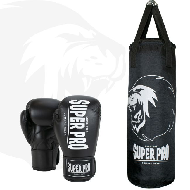 De Super Pro Combat Gear junior boksset bestaande uit een bokszak en een paar handschoenen. De bokszak heeft nylon hengsels waarmee u de bokszak makkelijk kunt ophangen. De bokszak is gemaakt van nylon wat gebruiksvriendelijk is en de vulling is van een katoen/canvas combinatie wat zorgt voor een mooi egaal gevulde bokszak en de stoten en trappen absorbeert. De bokszak is 43 x 19 centimeter. De bokshandschoenen gemaakt van zwart PU in 6 oz, hebben een fijne pasvorm en beschermen de handen en knokkels prima. Advies leeftijd van 4-8 jaar