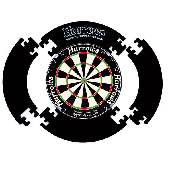 Dartbeschermrand 4 delig. Deze Dart Surround is gemakkelijk in elkaar te zetten zonder gebruik van gereedschap. Voorzien van het Harrows logo en een fluweelachtige laag die er voor zorgt dat de dartpunten minder zichtbaar zijn. Tweezijdig te gebruiken voor een lange levensduur. Exclusief dartbord.