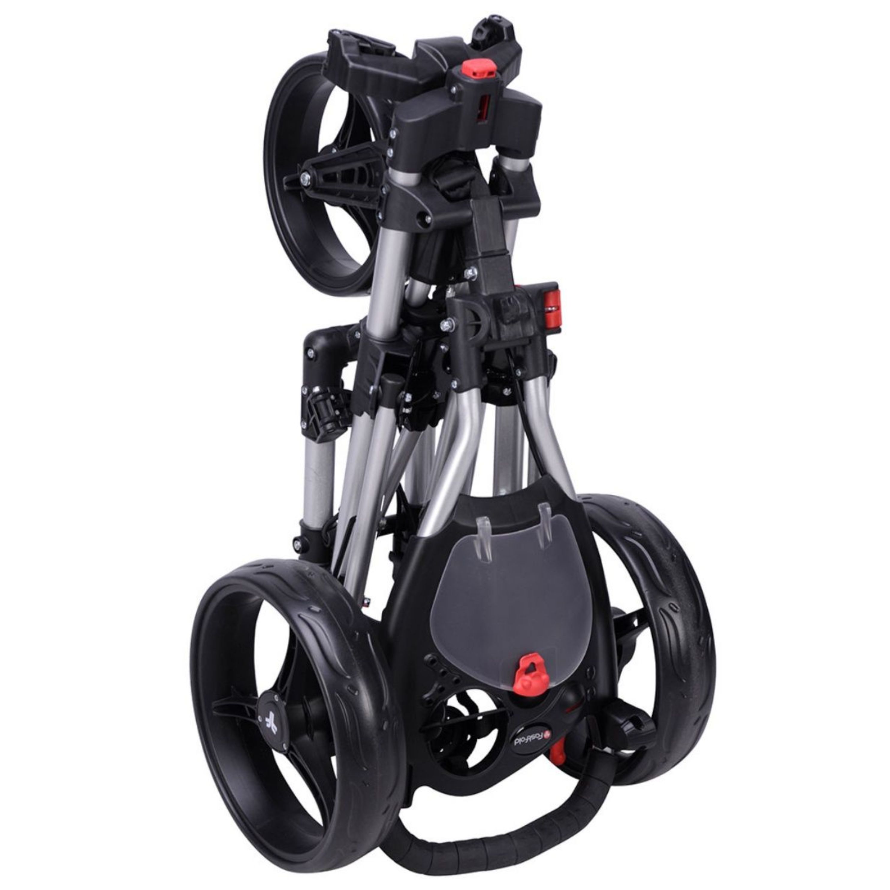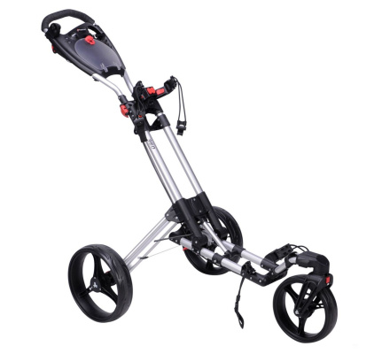 Fastfold HD 360 golftrolley. Deze trolley heeft een 360 graden draaiende voorwieltechnologie, gecombineerd met vouwtechnologie met één knop. Creëert het meeste gemak om de trolley op een golfbaan te gebruiken