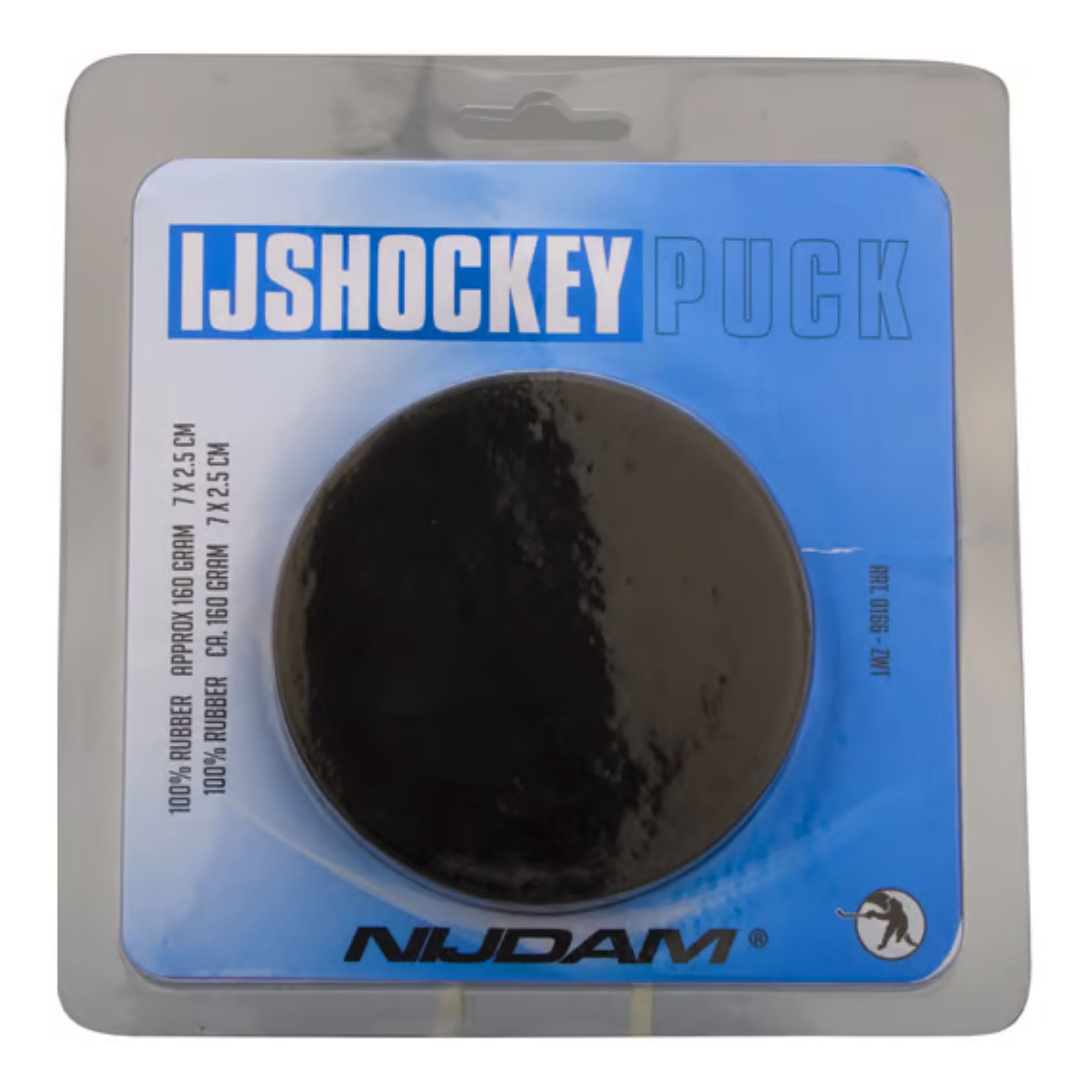Zwarte ijshockeypuck van Nijdam in blisterverpakking. De rubberen puck heeft een diameter van ca. 75 mm en een dikte van ca. 25 mm. Het gewicht is ca. 160 gram. 100% rubber.