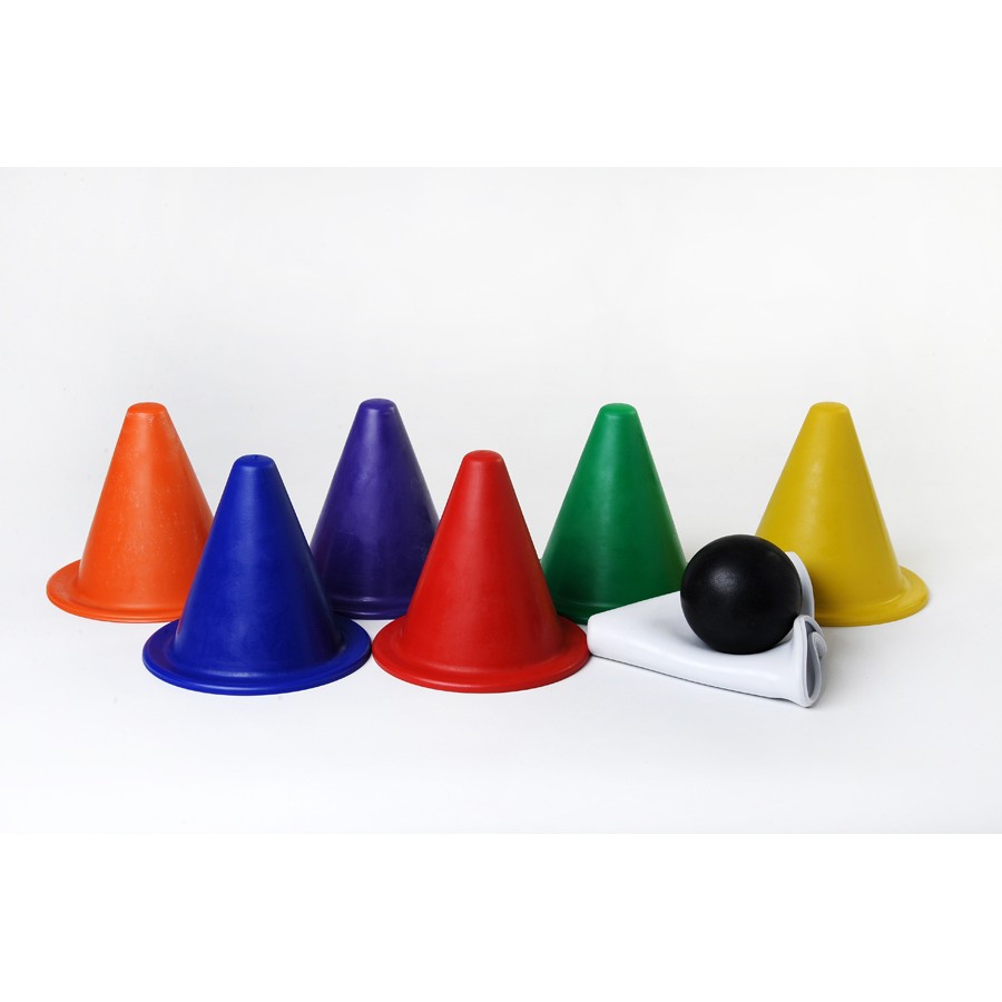Set van 10 rubberen kegels met een hoogte van 18 cm. Ronde brede basis. Ideaal voor scholen en clubs.
