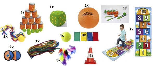 Twee zachte contact ballen omte mikken, werken, vangen zonder bang te zijn voor de bal. 4 Tennisballen, een springtouw van 1 meter in een vrolijke kleur, 4 kegeltjes. 8 Pittenzakjes (4 verschillende kleuren). Een foam dobbelsteen 16 x 16 x16 cm. Het spel eierlopen van foam en blikgooien. 3 Jongleerdoekjes, 2 pocoballen, 2 catch sets en een mega lang speelkleed Hinkelbaan. Alles in een mooie tas met draagriem.