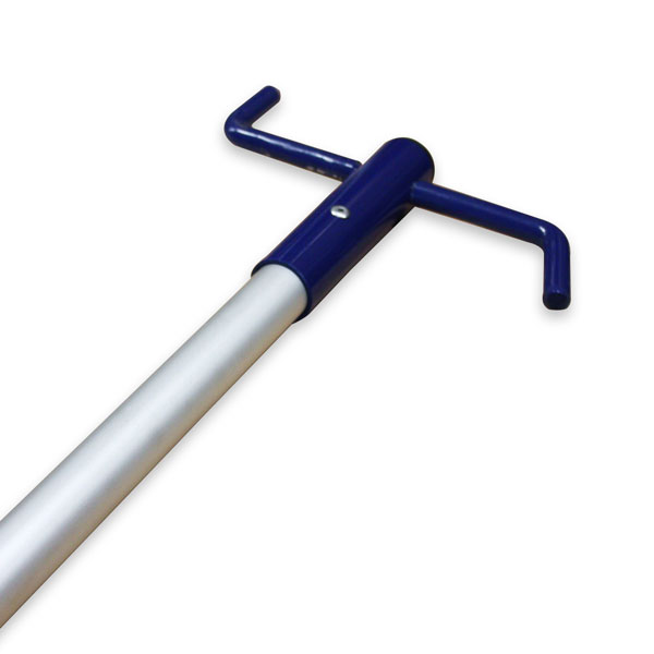 De ringenstok is gemaakt van geanodiseerde aluminium stok met aan de bovenzijde een met plastic beklede haak voor het eenvoudig naar beneden trekken van de turnringen.