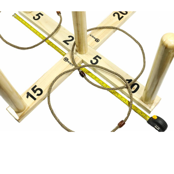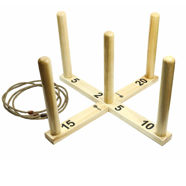 Door het harde Indiase hout, en de grote afmetingen is dit spel echt fantastisch om te spelen. De 5 staander, elk liefst 54 cm hoog, en bijna 7 centimeter dik, staan als een huis te wachten op de ringen. Werpt u de ringen, om de palen? Scoort u de hoogste score?