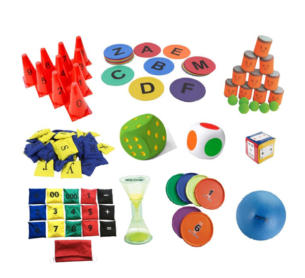 Blikgooien, pittenzakjesreken set in tas, ABC hinkelbaan (26 vloercirckels voorzien van het ABC), 2 x creatieve dobbelsteen, met transparante vakken, waarin opdrachten /letters/ vormen geschoven kunnen worden (niet inbegrepen). Dobbelsteen 16 x 16 cm, duurzaam, 10 kegels met cijfers 1 t/m 10, ABC pittenzakjes in tas, 52-delig (2x ABC), zandloper, luchtgevulde softplay footbal, en een set van 6 frisbees met cijfers. (Totaal 130 items)