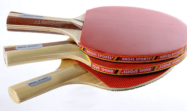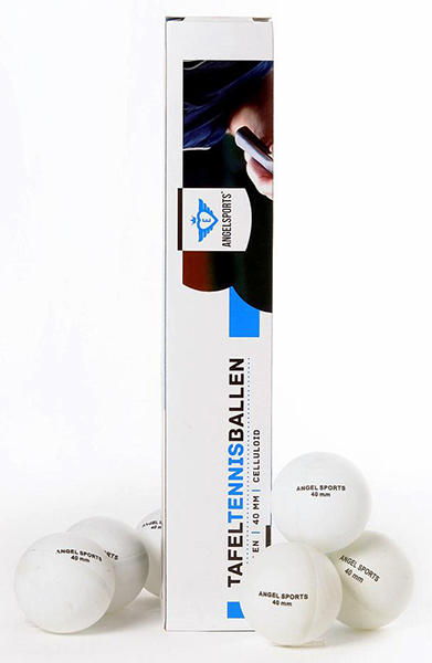 2 x Tafeltennis bat Angel Sport 2 ster. Met taps toelopend gelamelleerd houten handvat. Beide zijden voorzien van 2 mm glad sandwich rubber. 2 x 6 Tafeltennisballen merk Angel Sport, een recreatie bal met naad. Kleur wit, Ø 40mm. Verpakt in 2 doosjes met elk 6 ballen.