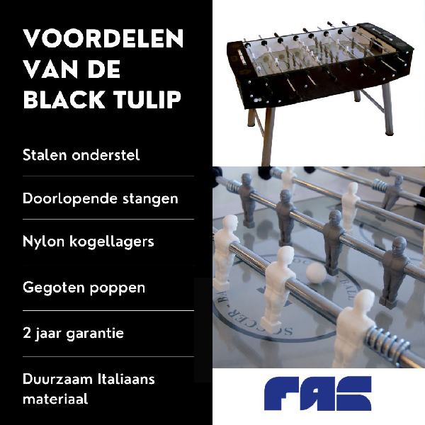 Het Black Tulip-model is een evolutie van het standaard Fun-model in een strakker, moderner jasje. Het nieuwe FUN model wordt compleet geleverd, zwart/wit uitgevoerd met daarbij inclusief een wit speelveld met spelers in het wit en grijs. Afwijkende vrachtkosten