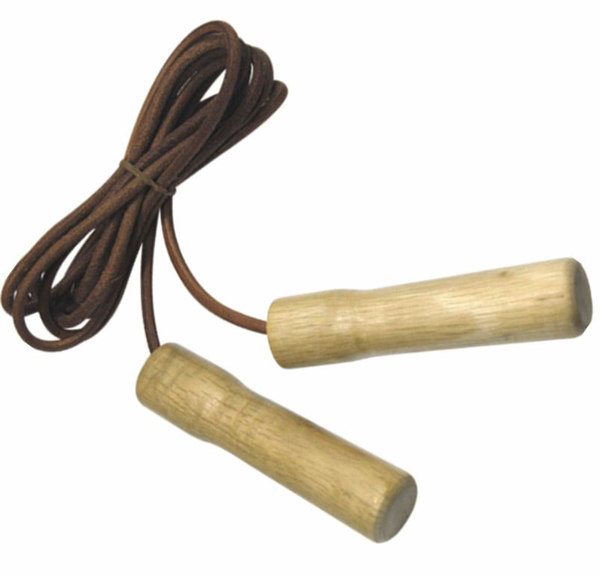 Springtouw gemaakt van leer met met houten handvatten. Het springtouw is voorzien van kogellagers. Lengte 2.5 meter.