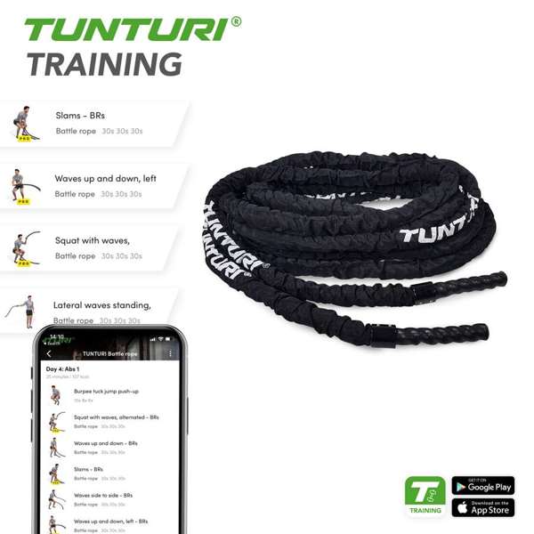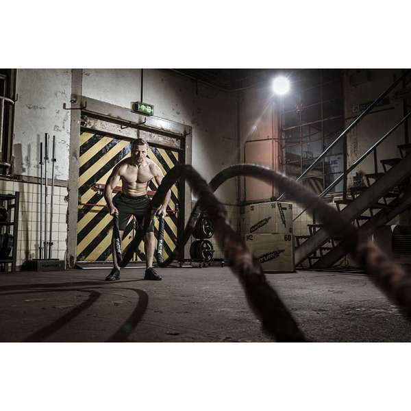 Leg twee van deze touwen voor je neer, bevestig aan gewichten of een speciaal muur- of vloeranker, pak de andere uiteinden vast en beweeg de touwen vervolgens om en om. Een ideale oefening voor het opbouwen van meer conditie. Battle ropes worden dan ook regelmatig gebruikt bij bootcamp of circuittraining. De fitness rope is zeer stevig en het materiaal is opgewassen tegen alle weersomstandigheden. Perfect dus om zowel binnen als buiten te gebruiken