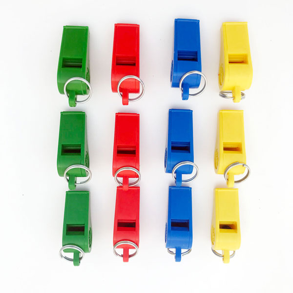 Set van 12 gekleurde kunststof scheidsrechter fluiten. De fluiten, hebben een metalen ring zodat je eenvoudig een koordje nek of pols koord kan bevestigen.